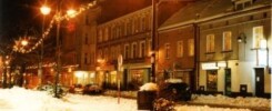 Tczew. Ulica Jarosława Dąbrowskiego nocą. W tle widoczny budynek przy ulicy Mickiewicza 1 – fotografia wykonana o godzinie 17:47 (31 grudnia 2000 roku)