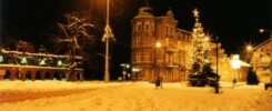 Tczew, ulica Jarosława Dąbrowskiego, ulica Jarosława Dąbrowskiego nocą, widok od strony ulicy Obrońców Westerplatte, Stare Miasto, kamienice Tczew, ozdoby świąteczne, iluminacja, iluminacja świąteczna, dekoracje świąteczne, dekoracje świetlne, dekoracje bożonarodzeniowe, Boże Narodzenie, budownictwo, architektura, ulica Jarosława Dąbrowskiego 18, ulica Jarosława Dąbrowskiego 17, ulica Jarosława Dąbrowskiego 16-16A, ulica Jarosława Dąbrowskiego 20, girlandy, szyldy, zagadnienia gospodarcze, gospodarka Tczew, handel, usługi, Księgarnia CREDO, fotograf Tczew, delikatesy Tczew, sklep wielobranżowy SEZAM, Sezam Tczew, ulice Tczew, urbanistyka, śnieg, zima, zima 2000, grudzień 2000, oświetlenie uliczne, samochody osobowe