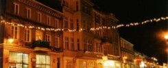 Tczew, Urząd Miejski w Tczewie, Urząd Miejski nocą, Plac Marszałka Józefa Piłsudskiego, Plac Piłsudskiego 1, Stare Miasto, choinka, choinka miejska, ozdoby świąteczne, iluminacja, iluminacja świąteczna, dekoracje świąteczne, dekoracje świetlne, dekoracje bożonarodzeniowe, Boże Narodzenie, budownictwo, architektura, drogowskaz z nazwami miast partnerskich, drogowskaz, Tczew – miasta partnerskie, gryf, zima, zima 2001, śnieg, grudzień 2001