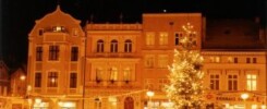 Tczew, ulica Jarosława Dąbrowskiego, ulica Jarosława Dąbrowskiego nocą, Stare Miasto, ozdoby świąteczne, iluminacja, iluminacja świąteczna, dekoracje świąteczne, dekoracje świetlne, dekoracje bożonarodzeniowe, Boże Narodzenie, budownictwo, architektura, grudzień 2001, zima, zima 2001, parking, samochody osobowe, ulica Jarosława Dąbrowskiego 4, ulica Jarosława Dąbrowskiego 5, ulica Kościuszki 1, ulica Jarosława Dąbrowskiego 7, poczta, gmach pocztowy, Urząd Pocztowy nr 1, PKO, biblioteka Stare Miasto, Miejska Biblioteka Publiczna im. Aleksandra Skulteta, ulica Jarosława Dąbrowskiego 6, ulica Jarosława Dąbrowskiego 7A, śnieg, kamienice Tczew, ulice Tczew, urbanistyka