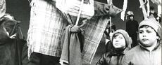 Tczew, ulica 30 Stycznia, ulica F. Dzierżyńskiego, ulica Dzierżyńskiego, Wieża Ciśnień, cmentarz katolicki ul. 30 Stycznia, cmentarz Stary, parada, przemarsz, widowisko, wiosna, wiosna 1985, powitanie wiosny, powitanie wiosny 1985, pierwszy dzień wiosny, pierwszy dzień wiosny 1985, marzec 1985, marzanna, obrzędy, etnografia, kultura ludowa, zwyczaje, tradycje, obrzędowość, obrzędy doroczne, folklor, topienie marzanny, zdjęcie grupowe, fotografia grupowa, dzieci, przechodnie, mieszkańcy Tczewa, muzyka, Harcerska Orkiestra Dęta, Harcerska Orkiestra Dęta Tczew, orkiestra Tczew, harcerze Tczew, Związek Harcerstwa Polskiego, Harcerska Orkiestra Dęta im. Stanisława Moniuszki w Tczewie, Jerzy Kubicki