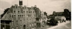 - budynek przy ulicy Zamkowej 5 – lewa, zacieniona strona kadru (budynek przy ul. Zamkowej wzniesiono w 1890 roku w miejscu zniszczonej przez pożar słodowni, obiekt wchodził w skład zespołu browarnego należącego do Johanna Allerta (ul. Zamkowa 1-6), około 1937 r. browar zamknięto i uruchomiono w nim m.in. wytwórnię wód mineralnych)