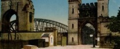 • portal mostu kratowniczego (drogowego) ozdobiony reliefami Gustawa Bläsera przedstawiającymi (w części centralnej) pruskiego króla Fryderyka Wilhelma IV / w kadrze widoczna część boczna portalu