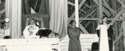 Tczew, Osiedle Bajkowe, ulica Rokicka, ulica Rokicka 1, Parafia Najświętszej Maryi Panny Matki Kościoła w Tczewie, Kościół NMP Matki Kościoła w Tczewie, Kościół pw. Najświętszej Maryi Panny Matki Kościoła w Tczewie, kościół – ulica Rokicka 1 – Tczew, Kościół NMP Matki Kościoła – ulica Rokicka 1 – Tczew, budowa kościoła, budowa kościoła Tczew, materiały budowlane, robotnicy, cieśle, zbrojarze, schody, szalunek, szalowanie, zbrojenie, kantówka, kantówki drewniane, stemple, stemple budowlane, drabina, Tczew sierpień 1993, Tczew 27 sierpnia 1993, Tczew 27.08.1993, lata 90. XX wieku