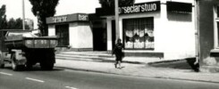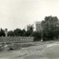 Tczew, Nowe Miasto, ulica Sobieskiego, ulica Wojska Polskiego, ulica Wojska Polskiego 17, ulica Wojska Polskiego 17A, ulica Wojska Polskiego 18, wiatrak tczewski, wiatrak harcerski, wiatrak typu holenderskiego, wiatrak holenderski, wiatrak pięcioramienny, wiatrak – ulica Wojska Polskiego – Tczew, wiatrak – ulica Wojska Polskiego 18 – Tczew, ulica Wojska Polskiego 18A, Dom Harcerza, Dom Harcerza – ulica Wojska Polskiego 18A – Tczew, kiosk, kiosk RUCH, bruk, kostka brukowa, kocie łby, samochód ciężarowy, oświetlenie uliczne, znak drogowy, widok od strony ulicy Sobieskiego, lata 70. XX wieku