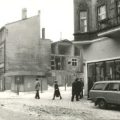 Tczew, Stare Miasto, ulica 1 Maja, ulica Wyszyńskiego, ulica Kardynała Stefana Wyszyńskiego, ulica Wyszyńskiego 13, plebania, plebania – ulica Wyszyńskiego 13 – Tczew, Parafia Podwyższenia Krzyża Świętego w Tczewie, zespół plebanii Kościoła pw. Podwyższenia Krzyża Świętego w Tczewie, ulica Wyszyńskiego 15, sklep motoryzacyjny, sklep motoryzacyjny – ulica Wyszyńskiego 15 – Tczew, ulica Wyszyńskiego 17-19, ulica Wyszyńskiego 17, ulica Wyszyńskiego 19, znak drogowy, samochód osobowy, Fiat 125p, duży Fiat, Fiat 126p, mały Fiat, maluch, przechodnie, dziecko, widok od strony fary, widok od strony kościoła pw. Podwyższenia Krzyża Świętego w Tczewie, październik 1990, 31 października 1990, 31.10.1990, 1990 rok, lata 90. XX wieku
