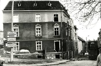 (czas powstania obiektu: lata 80. XX wieku) - kamienica mieszkalna [lewa strona kadru], ulica Ogrodowa 14 [niem. Gartenstrasse 14]