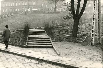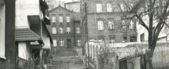 (czas powstania obiektu [budynek widoczny w kadrze]: około 1890 roku; pożar: październik 2007 roku; rozbiórka: brak danych; osunięcie muru oporowego: marzec 2025 roku; budowa obiektu mieszkalno-usługowego: lata 2025-2026;