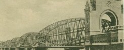 • brama wjazdowa na most kolejowy z charakterystyczną, zbliżoną do bramy wjazdowej mostu drogowego sekwencją wartowniczą (obiekt widoczny w tle)