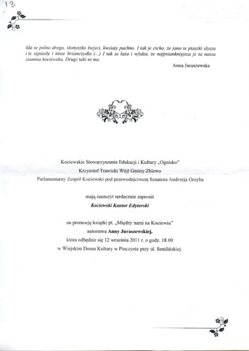 Tczew. VII Konkurs Fotograficzny „Wakacje z aparatem” pod patronatem starosty tczewskiego dr. Józefa Puczyńskiego. Fabryka Sztuk w Tczewie. Lata dwutysięczne Czarna Woda. Biesiada literacka „Wielcy nieznani twórcy Kociewia”. Lata 90. XX wieku Głos Wybrzeża; 2002 /23.07.2002/; nr 141; s. 7 Głos Wybrzeża; 2001 /13.12.2001/; nr 242; s. 6 Dziennik Bałtycki; 2001 /09.01.2001/; nr 7; s. 13 Dziennik Bałtycki; 2000 /21.11.2000/; nr 271; s. 18 Słowo Powszechne; 1987 /24-26.01.1987/ Głos Wybrzeża; 1987 /21.05.1987/ Dziennik Bałtycki; 1988 /08.12.1988/; nr 285; s. 6 brak danych Głos Wybrzeża; 1988 /12.01.1988/ Dziennik Bałtycki; 1998 /09.10.1998/; nr 216 Głos Wybrzeża; 1998 /06.07.1998/; nr 129 (15028) Dziennik Bałtycki (dodatek: Dziennik Tczewski); 1998 /4-5.07.1998/; nr 155 Tczew. Starogard Gdański. Świecie. Komunikat 06/2010 z dnia 16 marca 2010 roku [dotyczący organizacji IV Kongresu Kociewskiego] Tczew. Starogard Gdański. Świecie. Komunikat 05/2010 z dnia 9 marca 2010 roku [dotyczący organizacji IV Kongresu Kociewskiego] Tczew. Starogard Gdański. Świecie. Komunikat 04/2010 z dnia 4 marca 2010 roku [dotyczący organizacji IV Kongresu Kociewskiego] Tczew. Pierwsze zebranie robocze dotyczące IV Kongresu Kociewskiego – protokół Tczew. Realizacja zadań w zakresie edukacji regionalnej w okresie od 1 stycznia 2005 roku do 31 marca 2010 roku przez Miejską Bibliotekę Publiczną im. Aleksandra Skulteta w Tczewie – sprawozdanie Tczew. Uroczyste otwarcie wystawy „Kociewie w twórczości artystów ludowych” – zaproszenie Tczew. Piaseczno. 25-lecie zespołu Piaseckie Kociewiaki z Piaseczna – koncert jubileuszowy Tczew. Konkurs historyczno-literacki „Kociewska podróż do przeszłości – zachowane w pamięci” – ulotka informacyjna + regulamin Pinczyn. Promocja książki Anny Juraszewskiej „Między nami na Kociewiu” – zaproszenie Gdańsk. Promocja książki Andrzeja Grzyba „Zapiękna; prozy dawniejsze i nowe” – zaproszenie Starogard Gdański. Promocja czasopisma „Teki Kociewskie” (T. 2) – zaproszenie 25/25